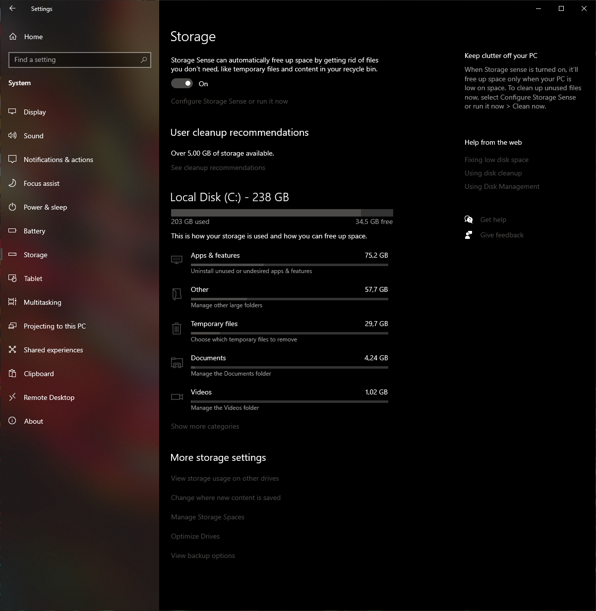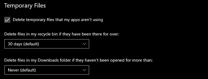 There is also a section for Temporary Files, for your Recycle Bin and Downloads the last one I would be careful with that’s why default it’s standing on ‘Never’.