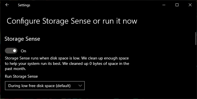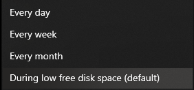 You have now the option to configure when the Storage Sense has to run, default it will stand on ‘During low free disk space (default)’.