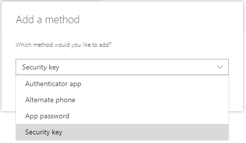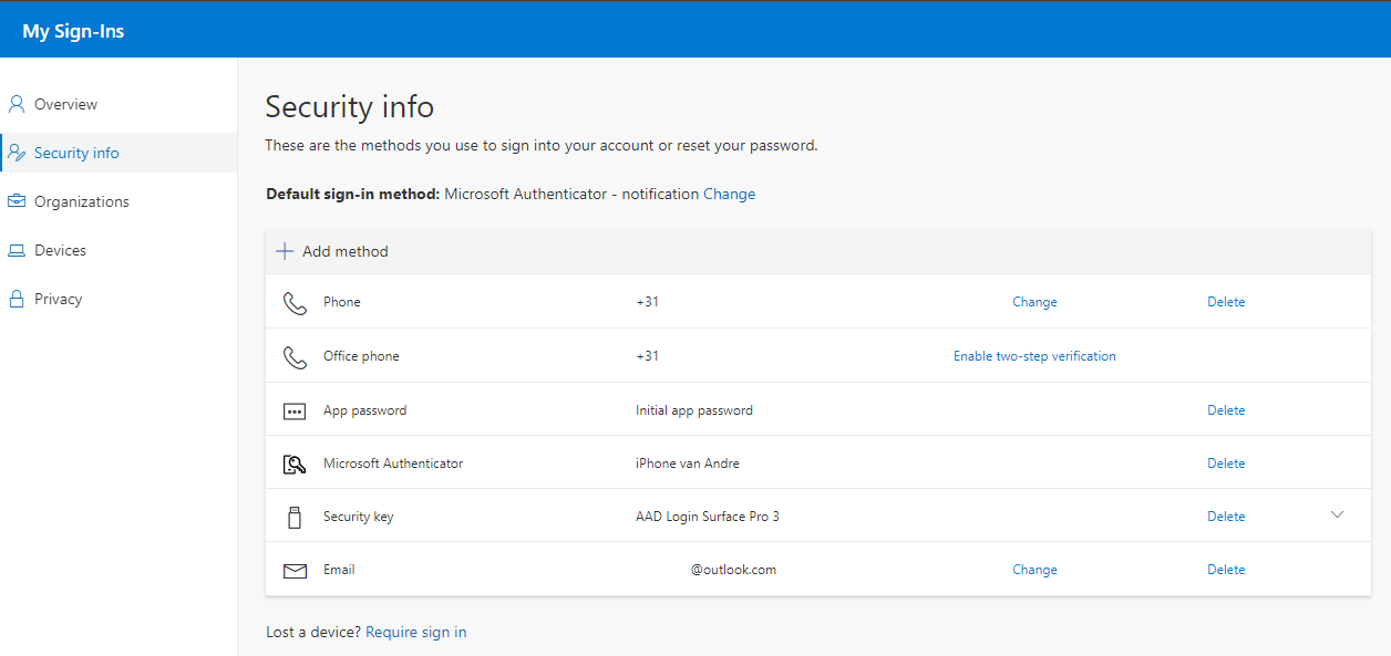 Now you see that I already have many different sign-in methods have configured, like my mobile number, office number, App Password, Microsoft Authenticator App, a Security Key from yubico and an alternative e-mail address outside of the tenant.