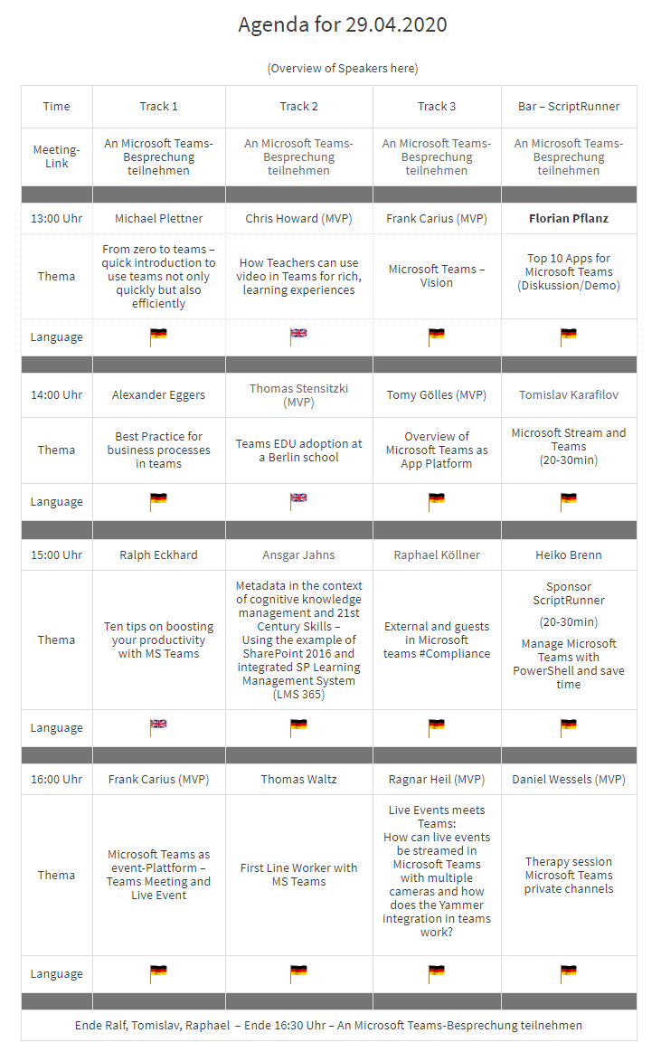 It is planned to start on 29.04.2020 at 01:00pm with three parallel tracks (Business / EDU), 4 sessions per track and everything within Microsoft Teams Meetings. In the fourth track, the bar, there is a relaxed atmosphere with a given topic of conversation.