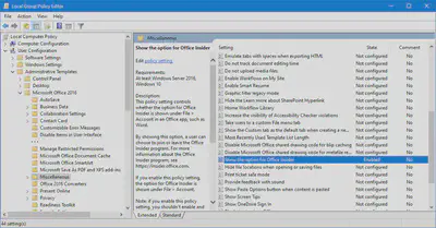 When enabling this policy, make sure the Update Channel and Update Path policies aren’t enabled or the Office Insider button will show but the selected Insider settings will not apply.