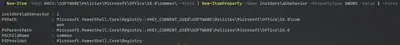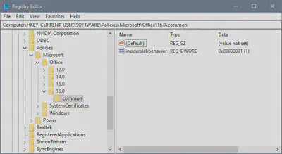 New-Item -Path HKCU:\SOFTWARE\Policies\Microsoft\Office\16.0\common\ -force | New-ItemProperty -Name insiderslabbehavior -PropertyType DWORD -Value 1 -Force